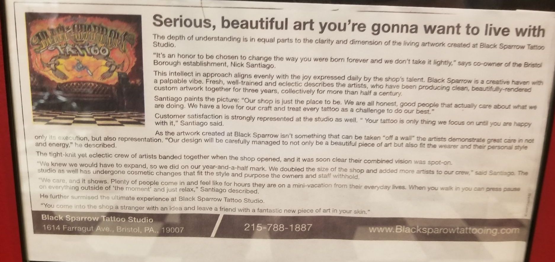 Black Sparrow Tattoo Studio provides tattoos featuring neo traditional, Japanese traditional, black and gray, color, and illustrative styles. We offer a safe, cleanly space for you to express yourself in Bristol, PA.